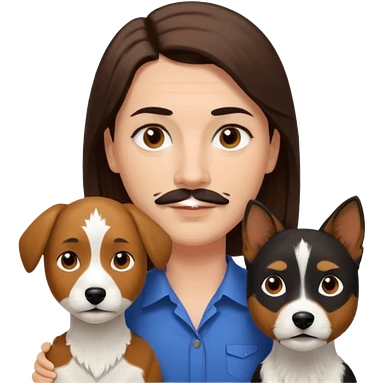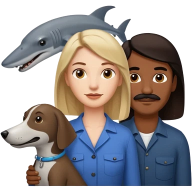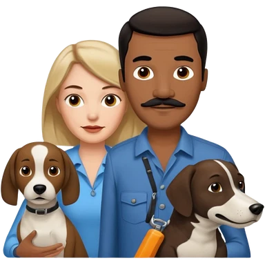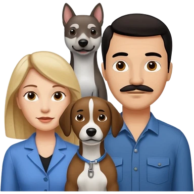 Quiero a una mujer blanca con el pelo por el hombro lacio castaño claro con un hombre morochito con el pelo negro y bigote, y un perro blanco tipo perro cabeza de martillo emoji