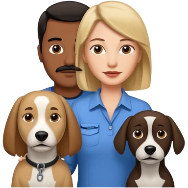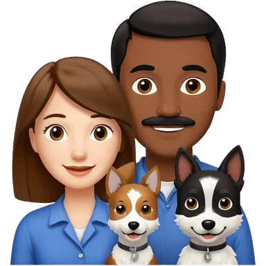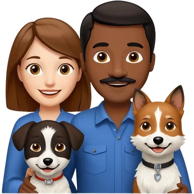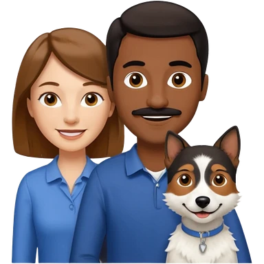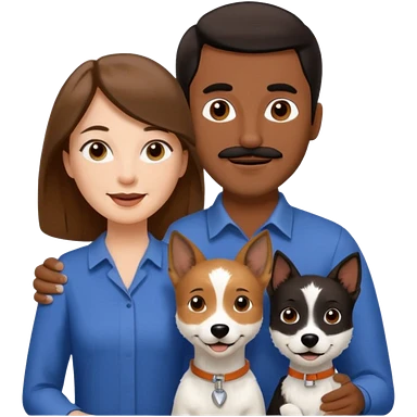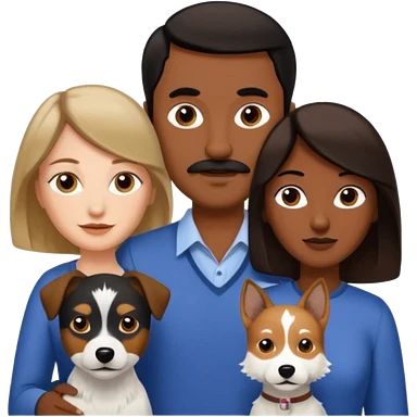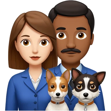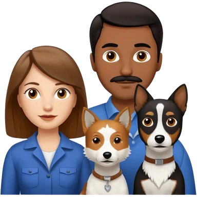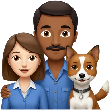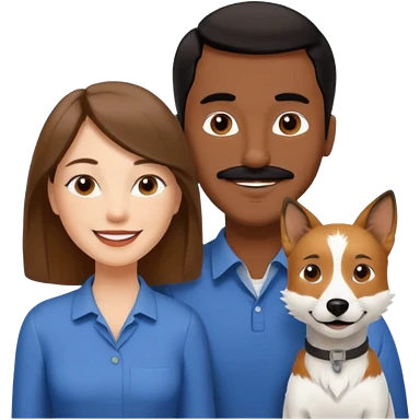 Quiero a una mujer blanca con el pelo por el hombro lacio castaño con un hombre de color morochito con el pelo negro y bigote, y un perro blanco Fox terrier emoji