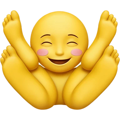 Cute 3D yellow smiley, closed eyes, smile, feet up, hands under chin, white background. emoji