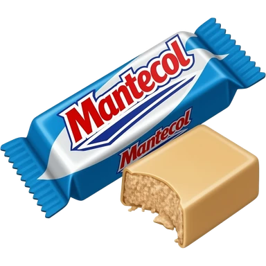 Argentine candy ‘Mantecol’. Centered, clean vector design, soft shading. Show a rectangular beige peanut nougat bar with a slightly crumbly texture, with a small cut piece revealing the airy interior. Include a simple wrapper in blue and white with the word ‘Mantecol’ in bold red letters emoji