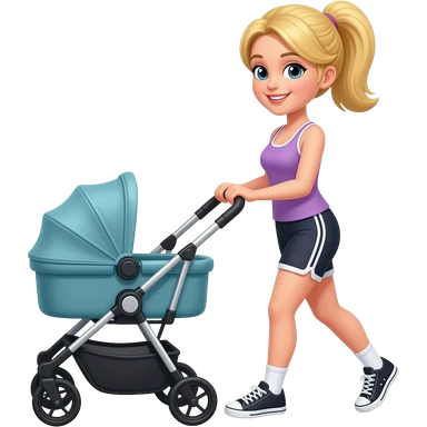 Mom pushing stroller. Blonde hair ponytail In bike shorts sneakers with ankle socks and tanktop emoji