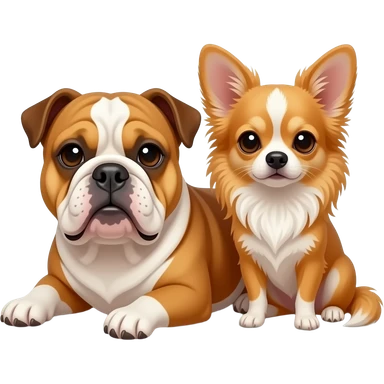Een engelse Bulldog die tegen een langharige chihuahua aanligt. beiden hebben lichtbruin haar met wit emoji