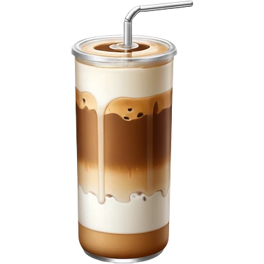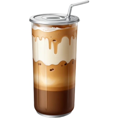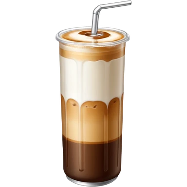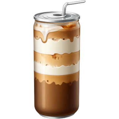 A tall transparent can of iced latte with a silver pull-tab lid. Brown coffee on top with ice, smooth white milk in the middle, and a light amber syrup layer at the bottom. “MAISON MOKA” written vertically in white on the can. emoji
