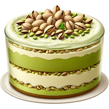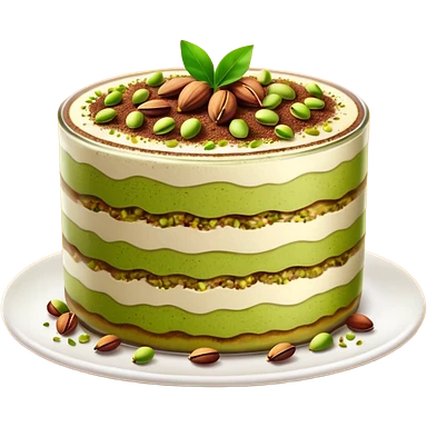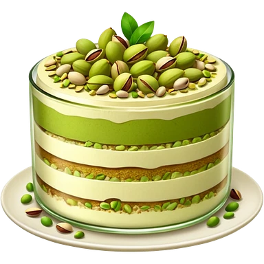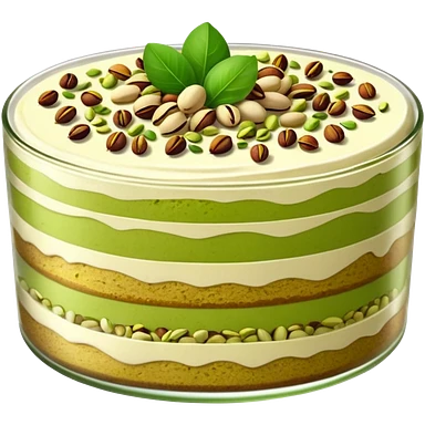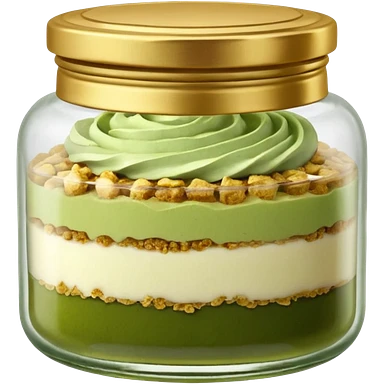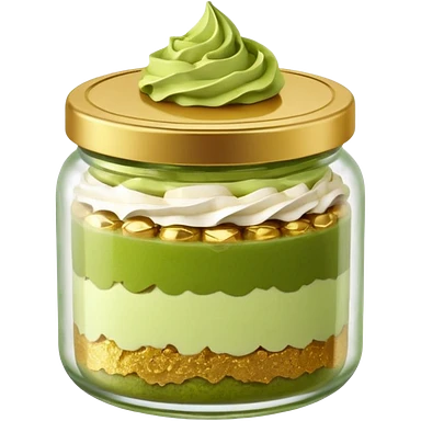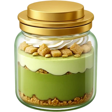 A small round glass jar with a gold lid, filled with layered dessert: creamy white base, green matcha layer in the middle, and a crunchy topping on top. emoji