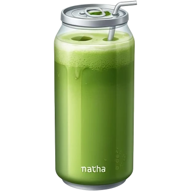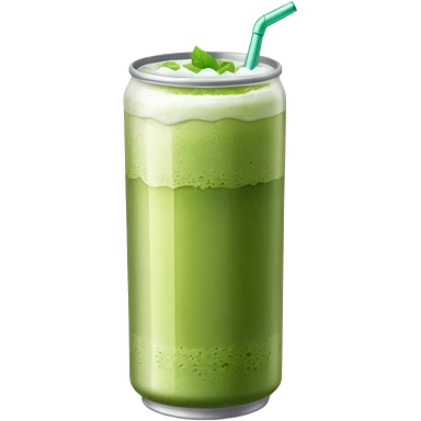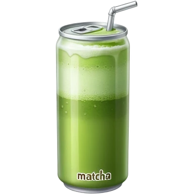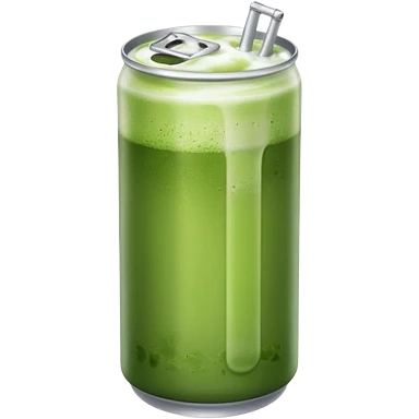 Create an emoji-style illustration of a tall, transparent can-shaped drink filled with iced matcha. The top is sealed with a silver metal pull-tab lid. The drink has a green matcha layer on top that gradually fades into a milky white layer at the bottom. The can is sleek and minimalist. emoji
