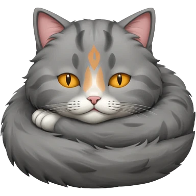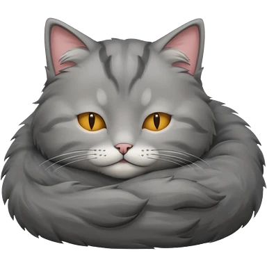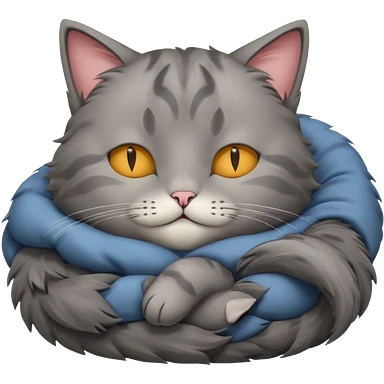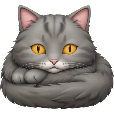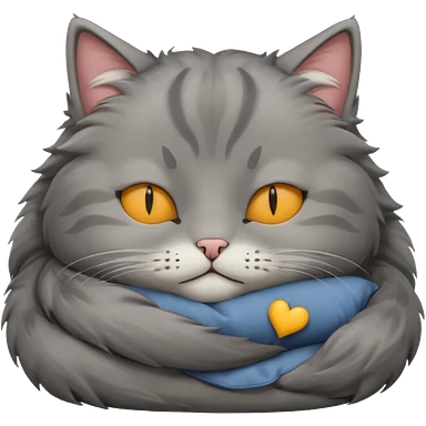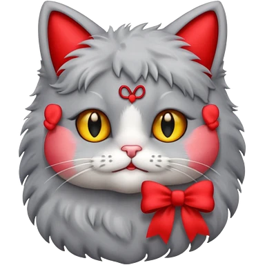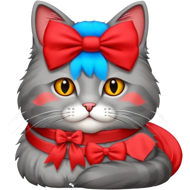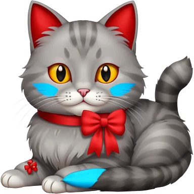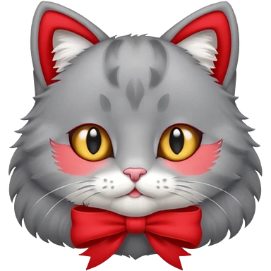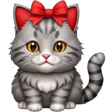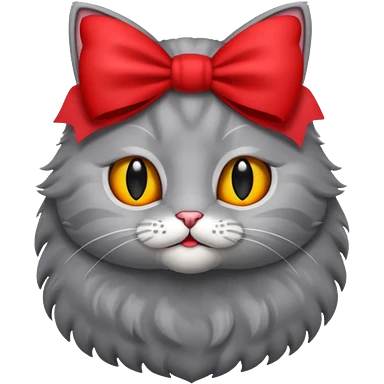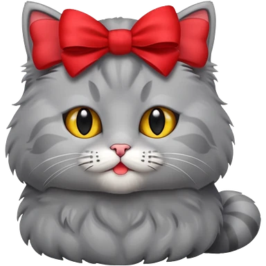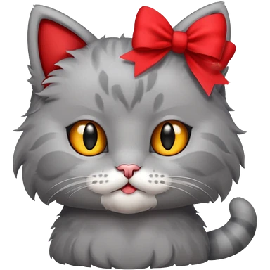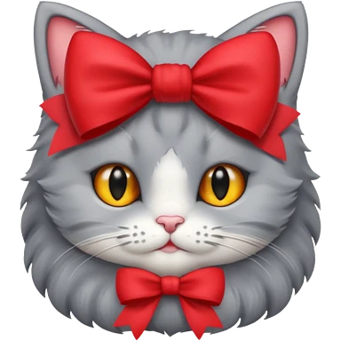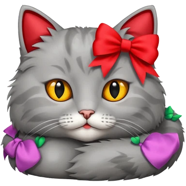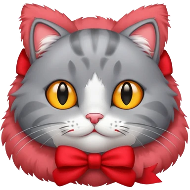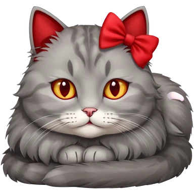 A fluffy grey cat is lying down with a red bow on its neck. emoji
