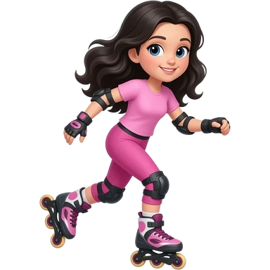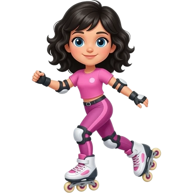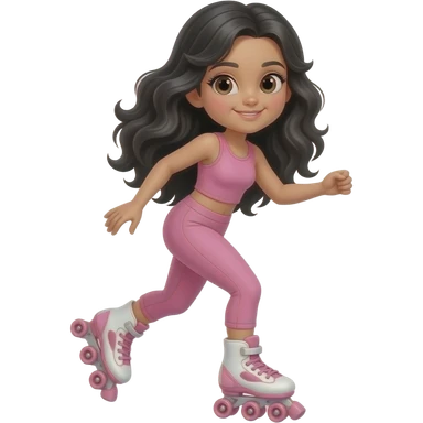 young girl, black waves hair, pink complete top and leggings, rollerblading emoji