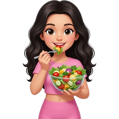 young girl, black waves long hair, pink complete top and leggingg, light skin, eats healthy food emoji