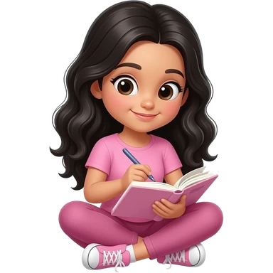 young girl, black waves long hair, pink complete top and leggingg, light skin, writes a diary emoji