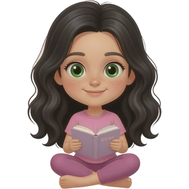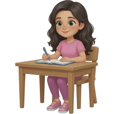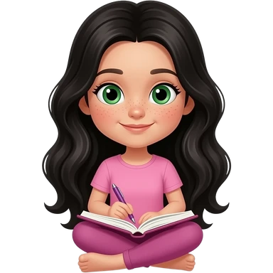 young girl, green eyes and freckles black waves long hair, pink complete top and leggingg, light skin, writes a diary emoji
