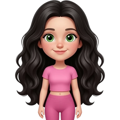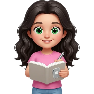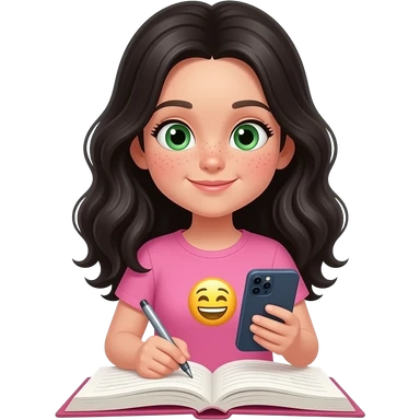 young girl, green eyes and freckles black waves long hair, pink complete top and leggingg, light skin, 3d realistic, iphone emoji,writes a diary emoji