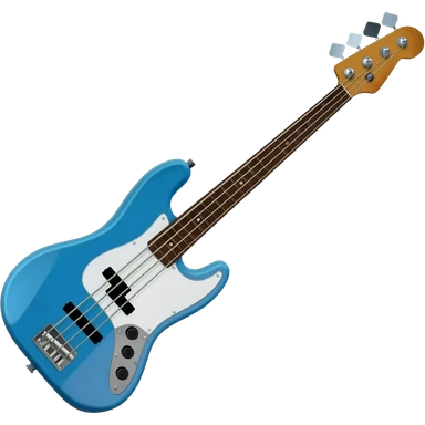A cobra-blue four-string Precision-style bass guitar with a white pickguard and black split pickup, rendered in a simplified emoji style with soft highlights. The instrument is placed diagonally with the body at the lower left and the headstock at the upper right. emoji