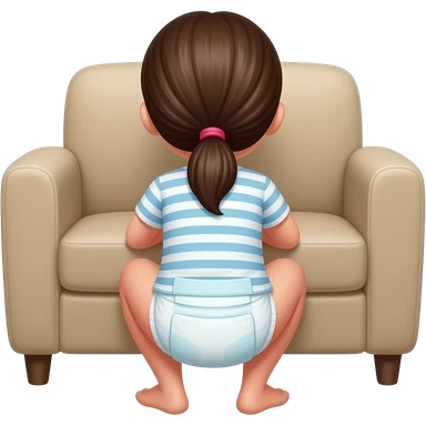 Back view of a 10yo girl wearing a nappy and a t shirt hiding behind a sofa to squat emoji