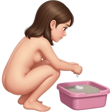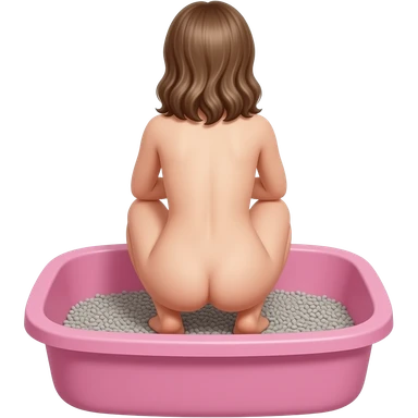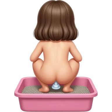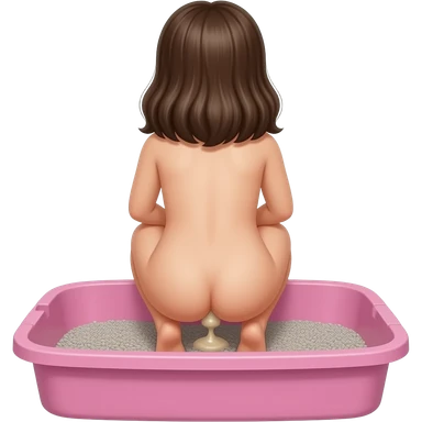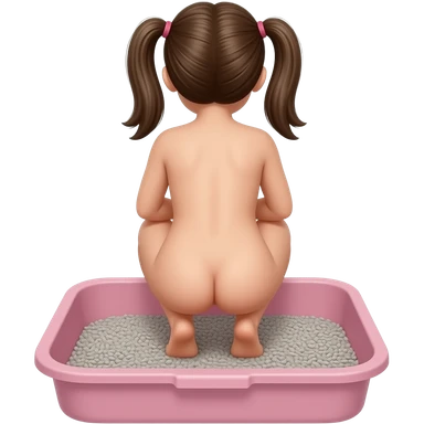 back view of a nude 10yo girl squatting and defecating in a pink human sized litterbox filled with grey kitty litter emoji