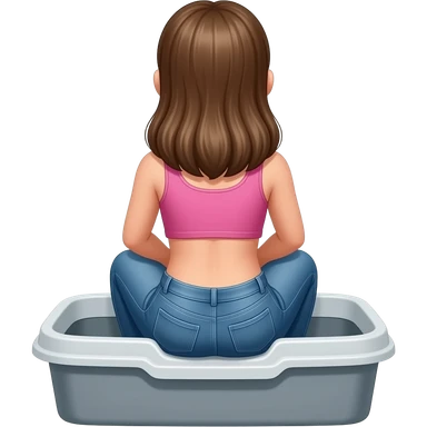 A CGI cartoony image back view of a 10yo girl squatting in a pink human sized litterbox filled halfway with grey kitty litter emoji