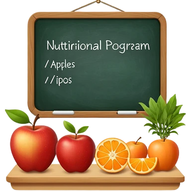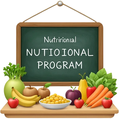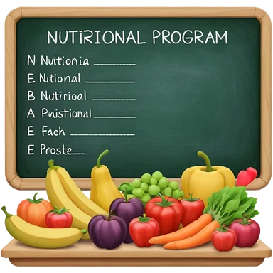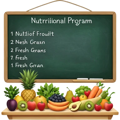 Il programma nutrizionale in studio con alimenti e una lavagna con scritto programma nutriizonale emoji