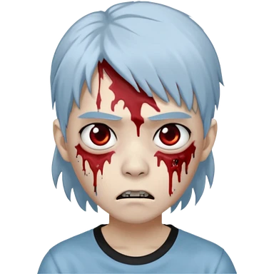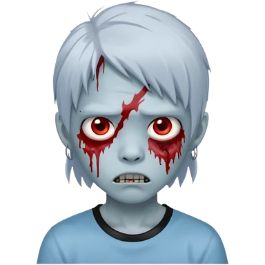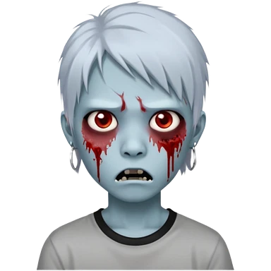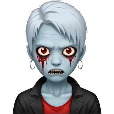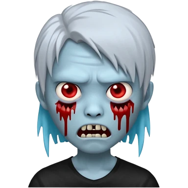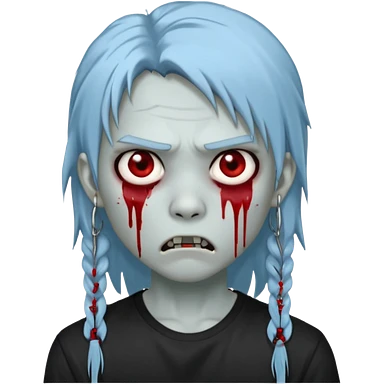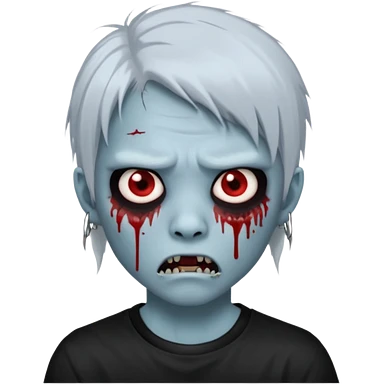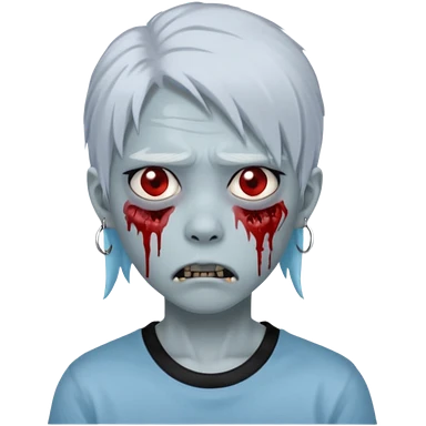 3D emoji-style avatar with very pale blue-grey zombie skin , a young Asian face, and large eyes with blood tears. Give it white litle bit messy mullet hair style , silver hoop earrings, and a plain black T-shirt. The face expression should be slightly angry, with vampire fang emoji