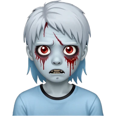 Create a 3D emoji-style avatar with very pale blue-grey zombie skin like the reference image, a young Asian face, and large eyes with blood tears. Give it white mullet hair style , silver hoop earrings, and a plain black T-shirt. The face expression should be slightly angry, with vampire fang emoji