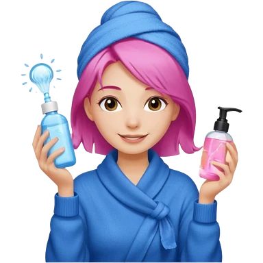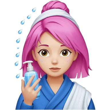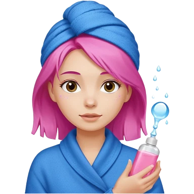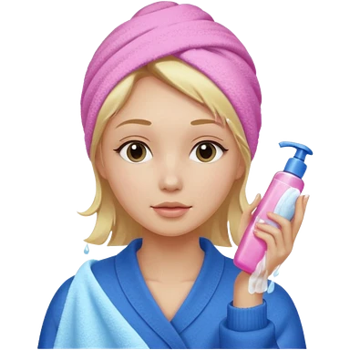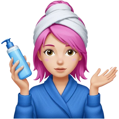 A girl grabbing a pink hair serum with a white shower towel in her hair with skincare on her face dressed in a blue sweater emoji