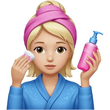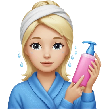 A girl grabbing a pink serum with a towel in blonde hair with a white shower towel in her hair with skincare on her face dressed in a blue sweater emoji