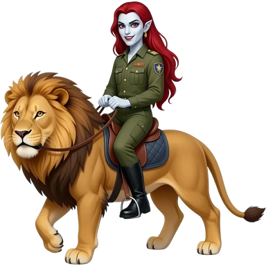 vampiro con pelle bianca e i capelli lunghi e rossi con una tuta stile "militare" che cavalca un leone emoji