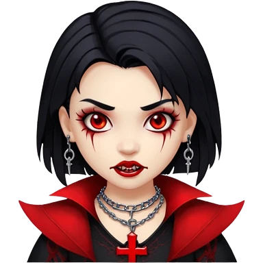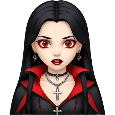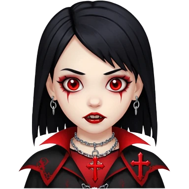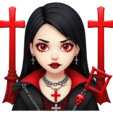 a girl with a very light skin,red eyes,fangs like vampire,black hair with red mesh,with goth clothes and a chain with a cross on it emoji