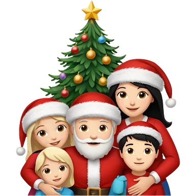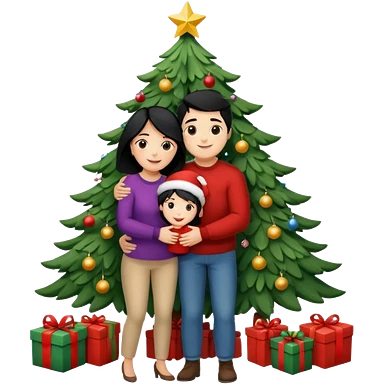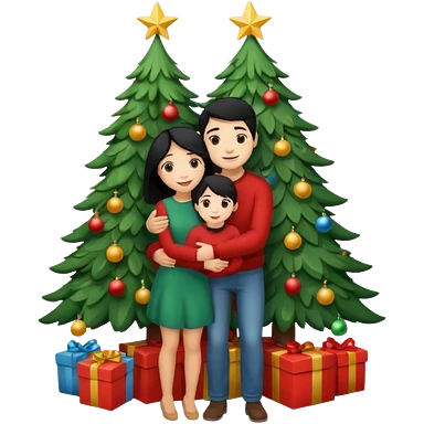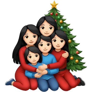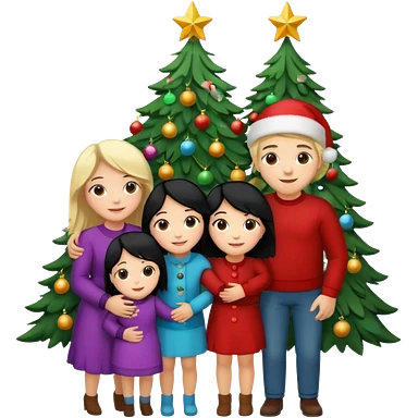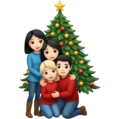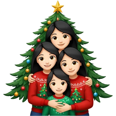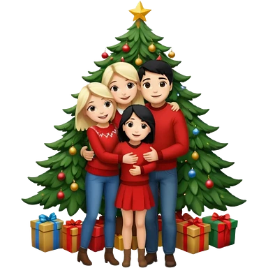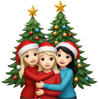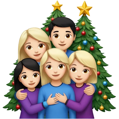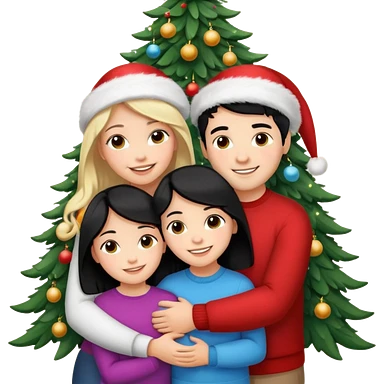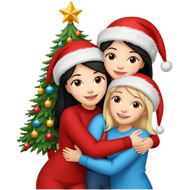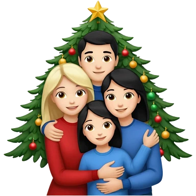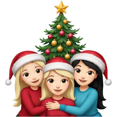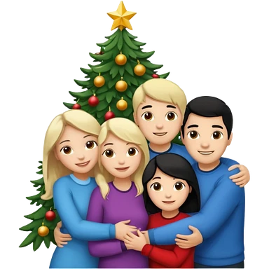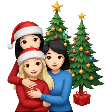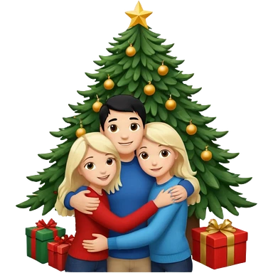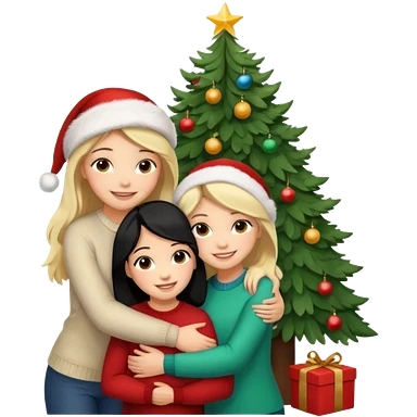Generate Christmas-style emojis family. Where light-skinned people stand near the tree all together, hugging and smiling. 2 girl should be Light-haired woman, 1 woman black-haired woman, and add 1 man emoji