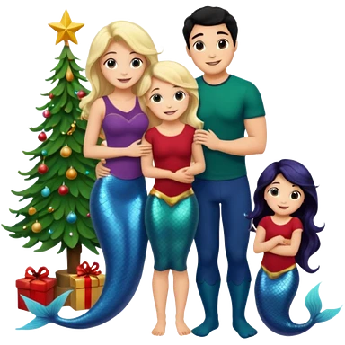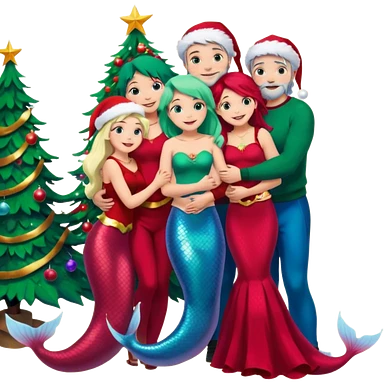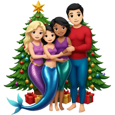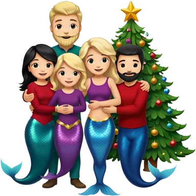 Generate Christmas-style emojis family. Where light-skinned people stand near the tree all together, hugging and smiling. girl should be Light-haired woman, mermaid woman, black-haired woman, and 1 man . Add 4 people: Mother, Sister, Sister, Brother emoji