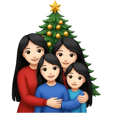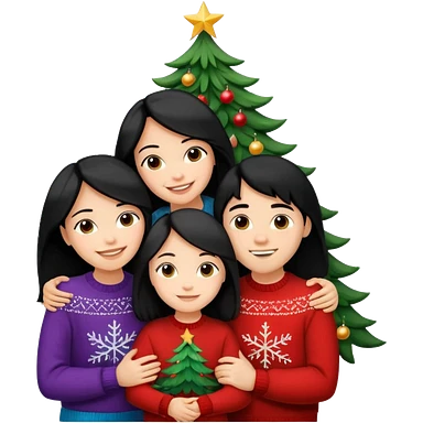 Generate Christmas-style emojis family. Where light-skinned people stand near the tree all together, hugging and smiling. One girl should be light-skinned with black long hair. Add 4 people: Mother, Sister, Sister, Brother emoji