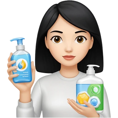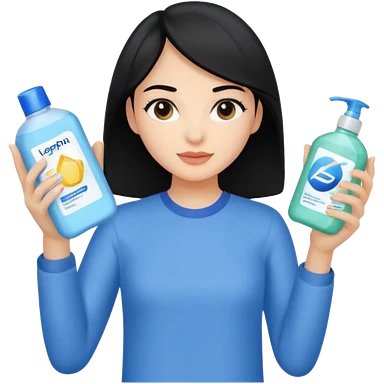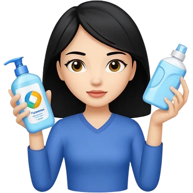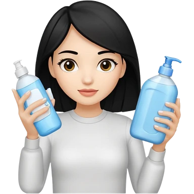 Generate a light-skinned girl with black hair who takes skincare. On the left hand side, she holds a detergent in her hand, and on the right hand side on the sheath, it is the one she applied. emoji