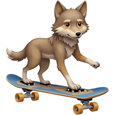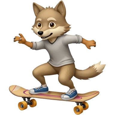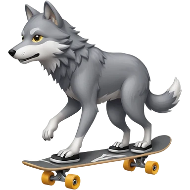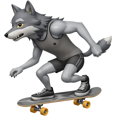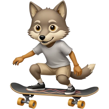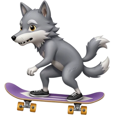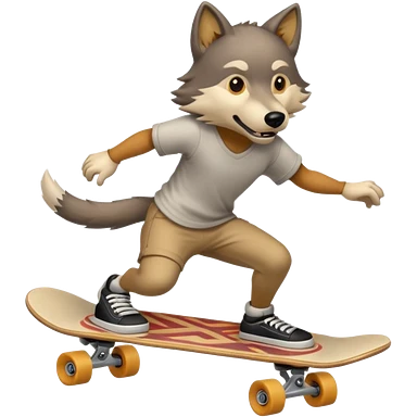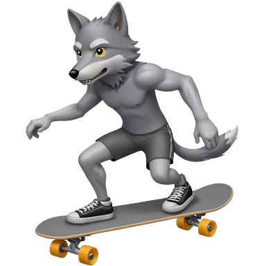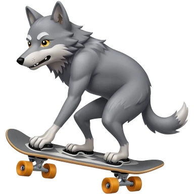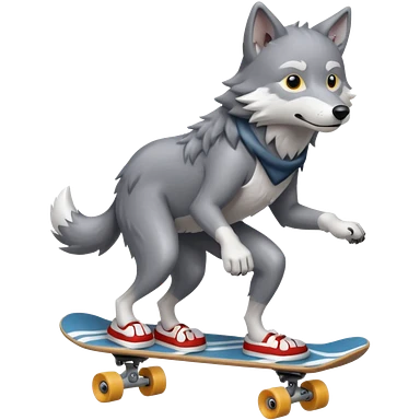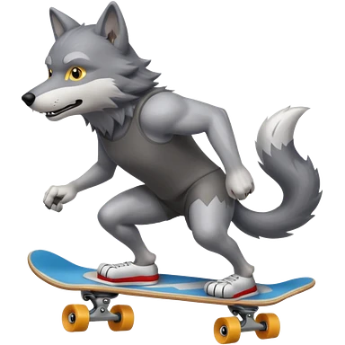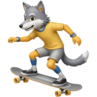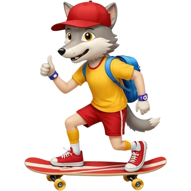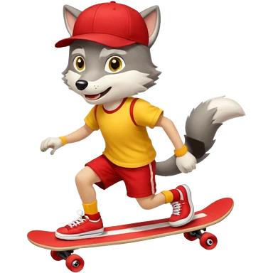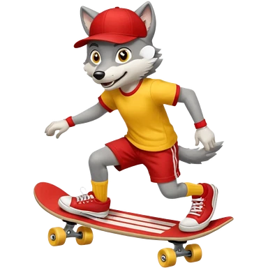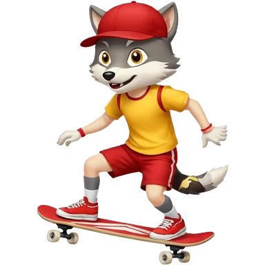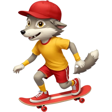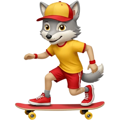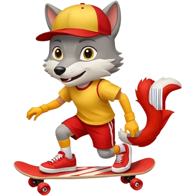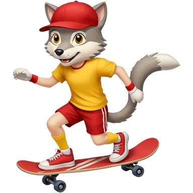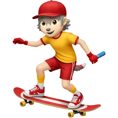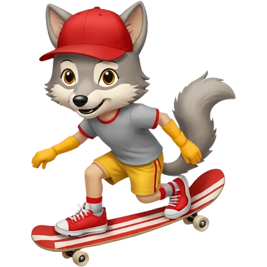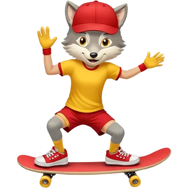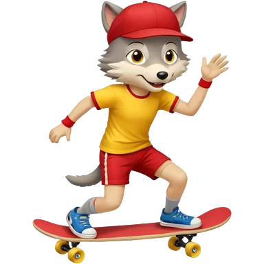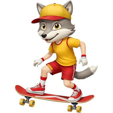 A gray wolf with large, expressive eyes and a friendly smile. The gray wolf is wearing a bright yellow T-shirt, red shorts, white knee socks, and sneakers. The baseball cap is on backwards. The wolf is preparing to perform a skateboarding trick. emoji