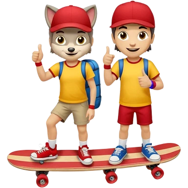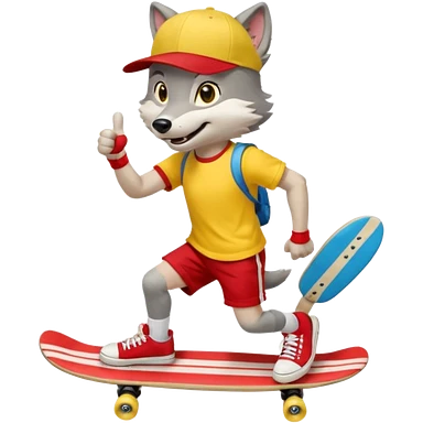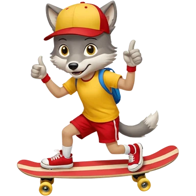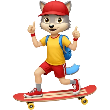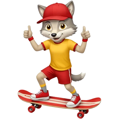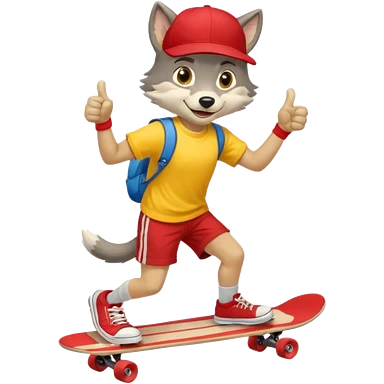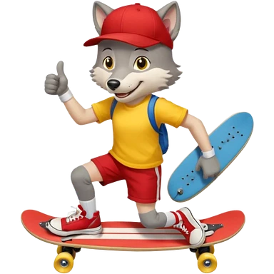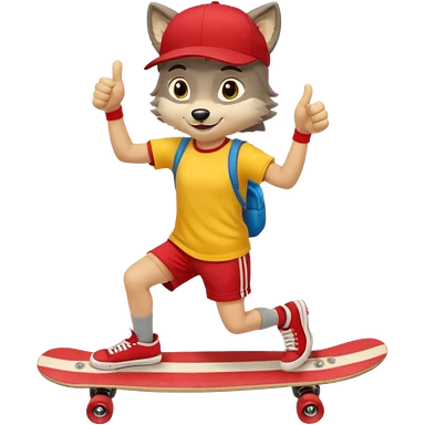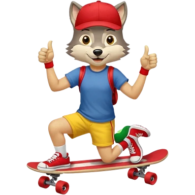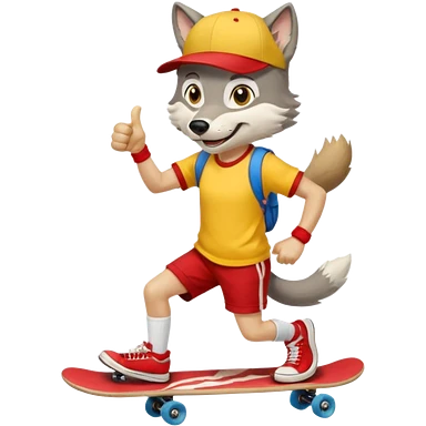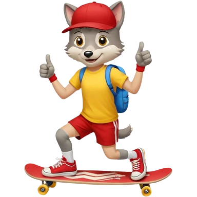 A gray wolf with large, expressive eyes and a friendly smile. The gray wolf is wearing a bright yellow T-shirt, red shorts, white knee socks, and sneakers. The baseball cap is worn backwards. The wolf holds a skateboard in one hand and gives a thumbs-up with the other, a confident and cheerful pose. emoji
