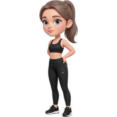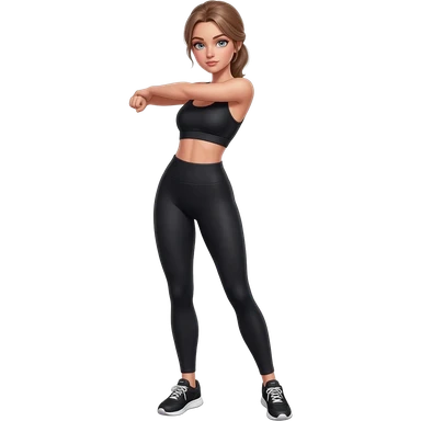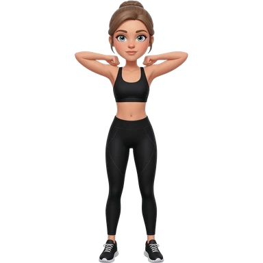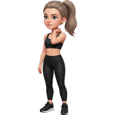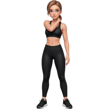 hand on neck, shoulder release pose, fair-skinned woman, gray-blue eyes, ash brown brows, ash light brown hair tied back, slim athletic body, black workout set, black sneakers with white soles emoji