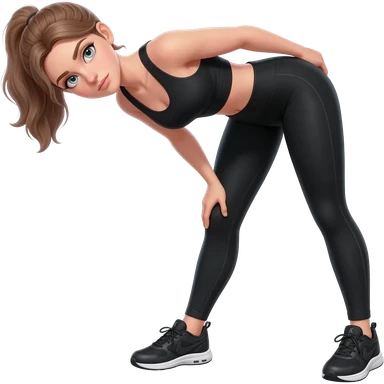 standing side bend, fair-skinned woman, light gray-blue eyes, ash brown brows, ash light brown hair tied back, slim athletic body, black workout set, black sneakers with white soles emoji