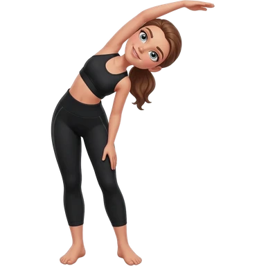 standing side bend, fair-skinned woman, light gray-blue eyes, ash brown brows, ash light brown hair tied back, slim athletic body, black workout set emoji