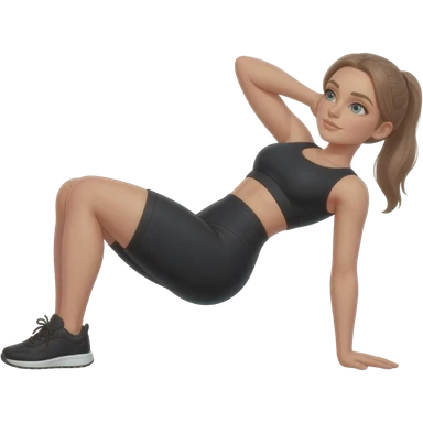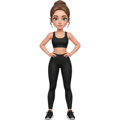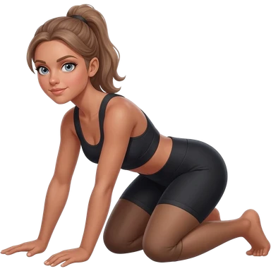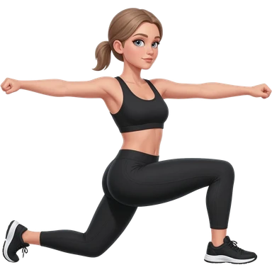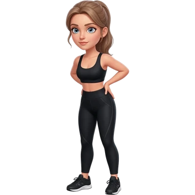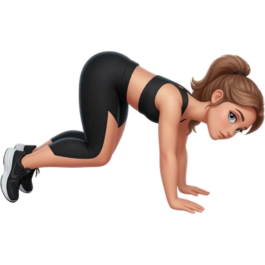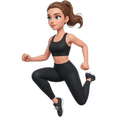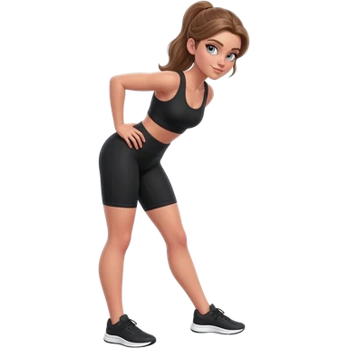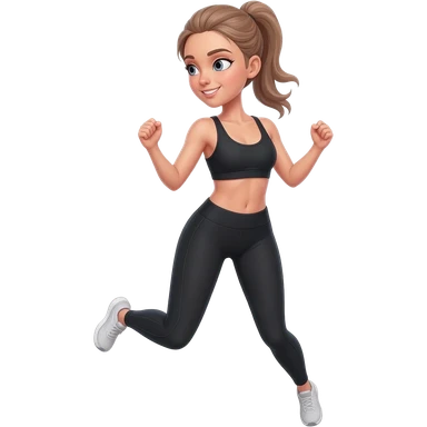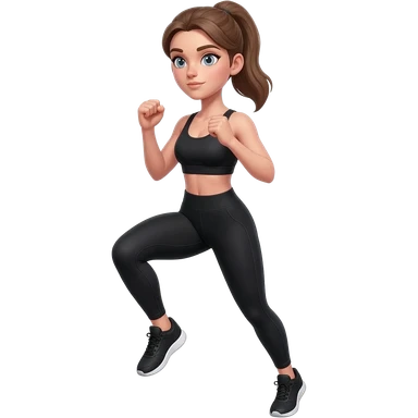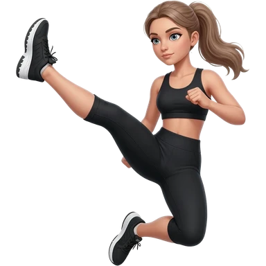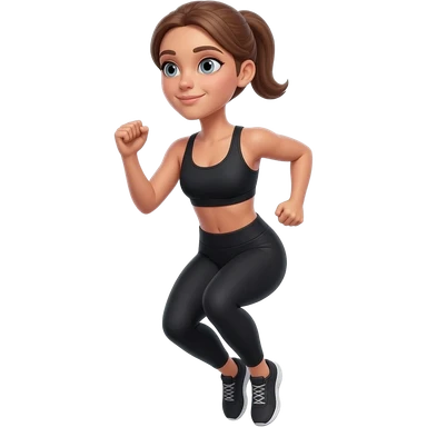 butt kicks, fair-skinned woman, light gray-blue eyes, ash brown brows, ash light brown hair tied back, slim athletic body, black workout set, black sneakers with white soles emoji
