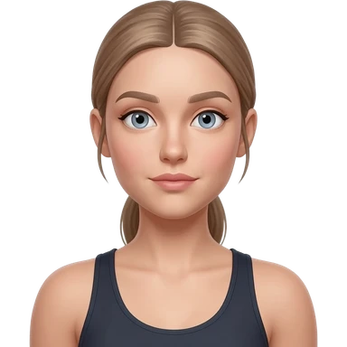 same woman: fair skin, light gray-blue eyes, ash brown eyebrows, light brown to dark blonde hair with a cool ash tone, center part, hair tied back, natural face, slim athletic body emoji