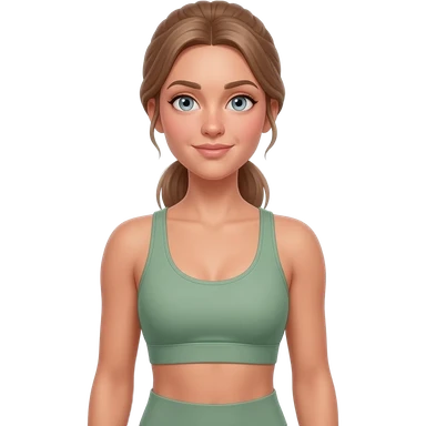 fair-skinned woman, light gray-blue eyes, ash brown brows, ash light brown hair tied back, slim athletic body, sage green workout set, gentle shoulder rolls, easy warm-up emoji