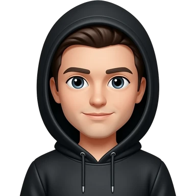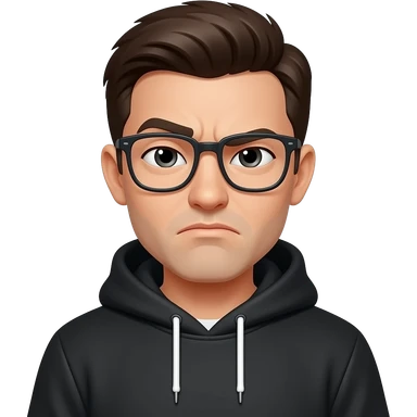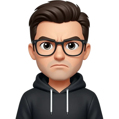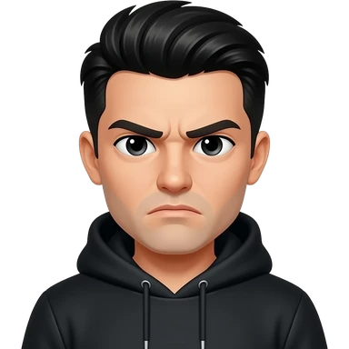 Slicked back black hair, black hoodie with hood down, frowning and squinting emoji