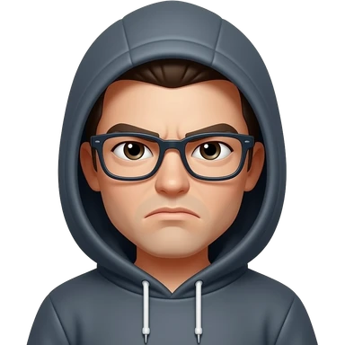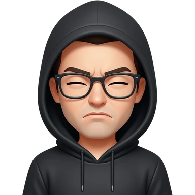 Make both eyes squinting with glasses and frowning, with a black hoodie on hood down emoji