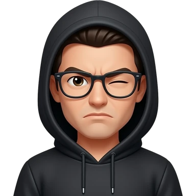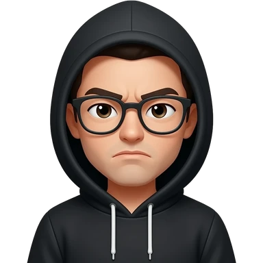 Black hoodie, hood down, both eyes squinting, glasses and a frowning face. emoji