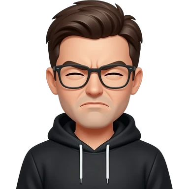 Black sweatshirt. Squinting both eyes. Glasses on. Frowning face emoji
