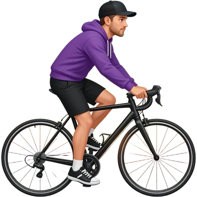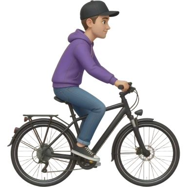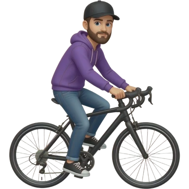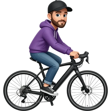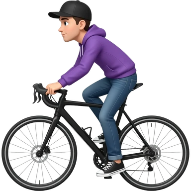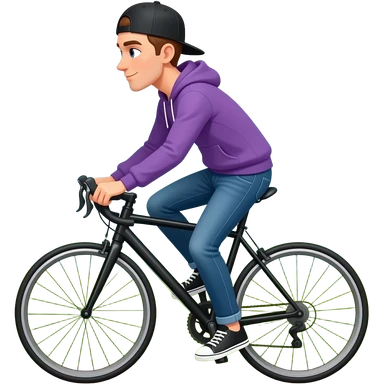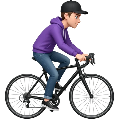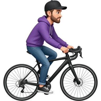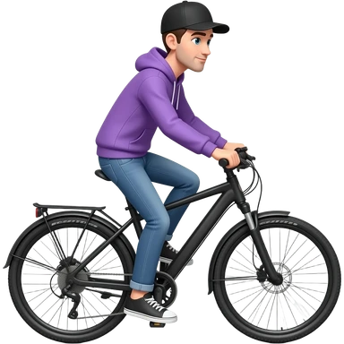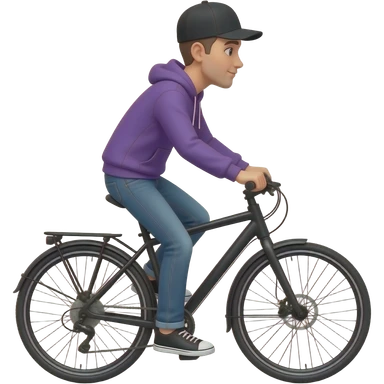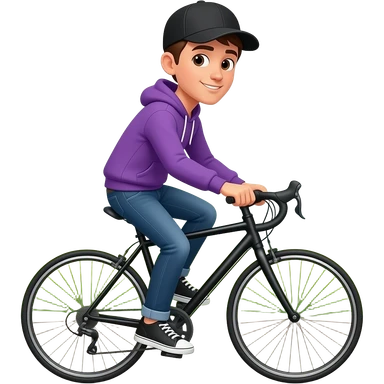 tall skinny guy with black basecap and purple hoodie and jeans rides a black bycicle in white background. emoji