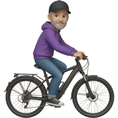 tall skinny guy with black basecap, circle beard and purple hoodie and jeans rides a black e-bike on white background. emoji