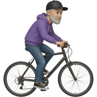 older tall skinny guy with black basecap, circle-beard and purple hoodie and jeans rides a black e-bike on white background. emoji