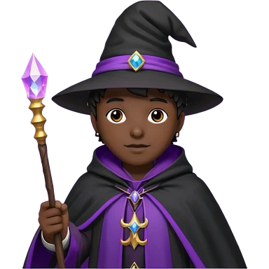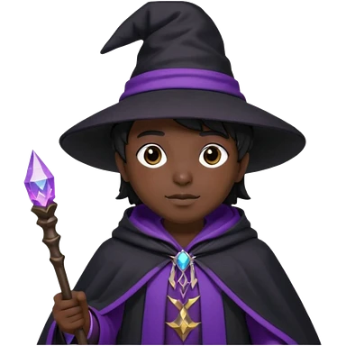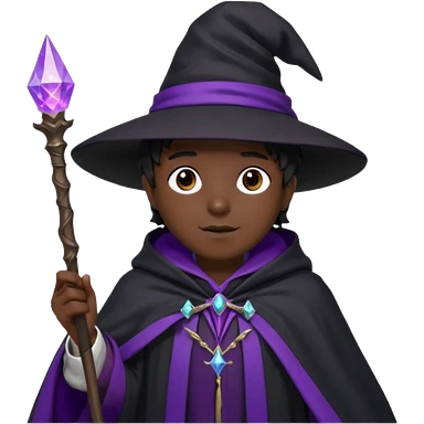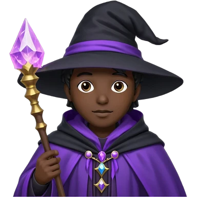 Wizard, black cloack with black hat, wand with purple magic, anime style, 3d emoji
