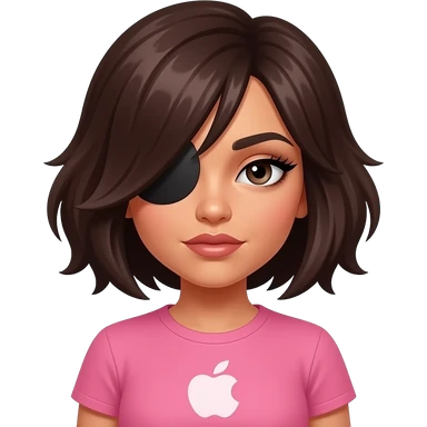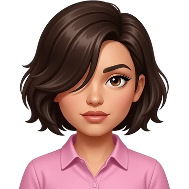 Emo Latina girl with volumized short dark brown hair swept In a side part covering her eye, intense eyeliner and lashes, and pink shirt emoji