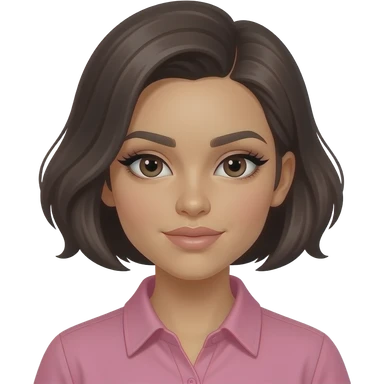 Latina girl with volumized short dark brown hair swept In a side part, intense eyeliner and lashes, and pink shirt emoji