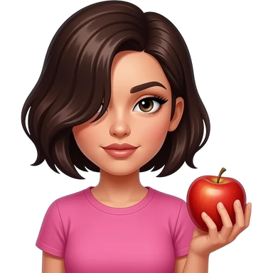 Emo Latina girl with volumized short dark brown hair swept In a side part covering her eye, intense eyeliner and lashes, and pink t shirt, black eyeshadow, apple emoji emoji