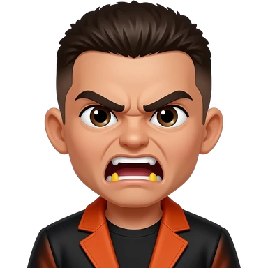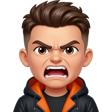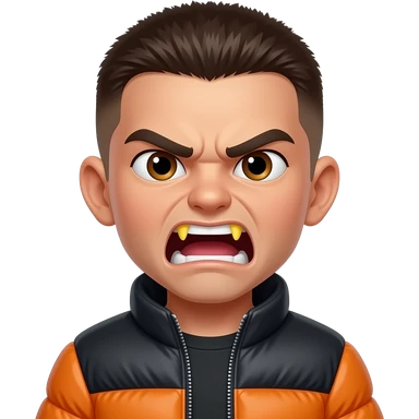 A mean angry boy with a brown buzz cut fluffy, brown thin eyes, tan skin, hairy thick eyebrows, and a black and orange coat, and yellow teeth screaming emoji